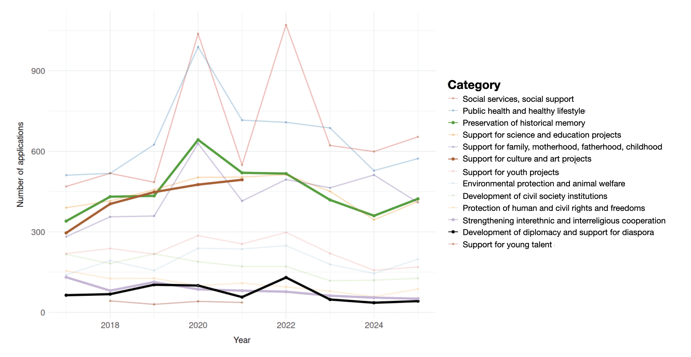 Chart 1 shows that these categories do not represent a majority of winning applications, even when combined. Moreover, there is no visible growth in applications from these categories in the lead-up to or at the start of the full-scale war against Ukraine in 2022. A jump is visible in 2020, but it is attributable to the 75th anniversary of World War II.