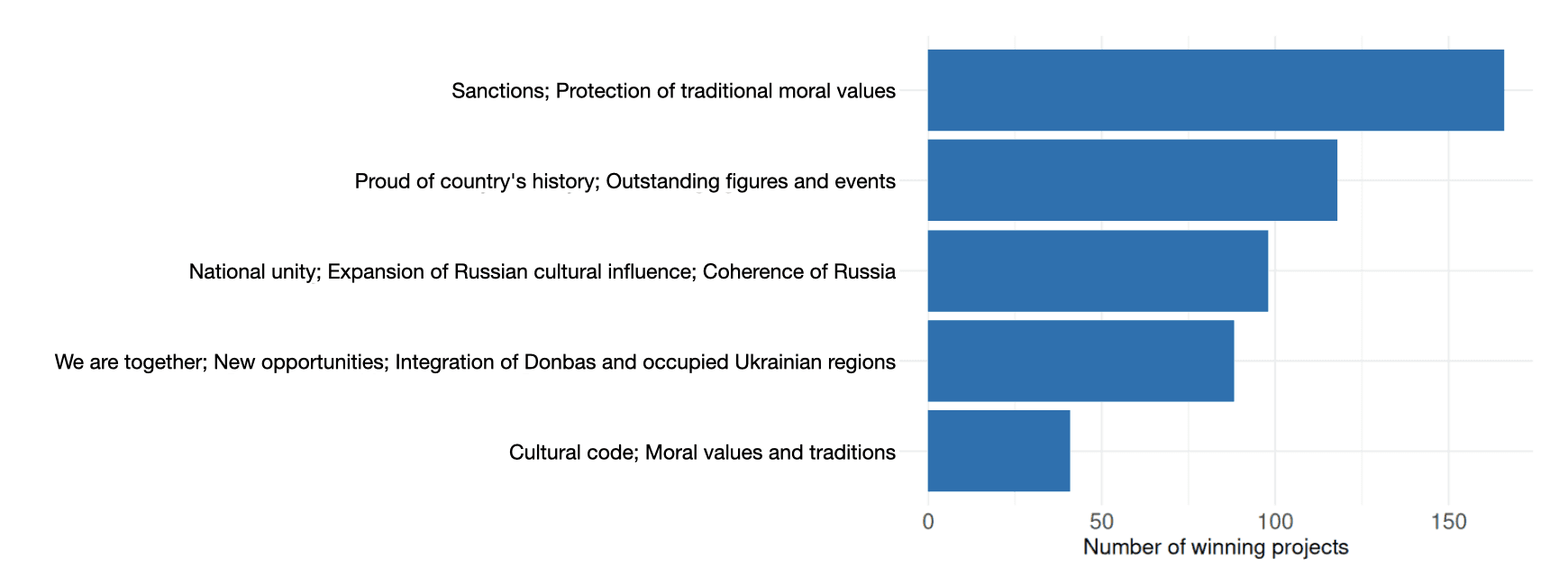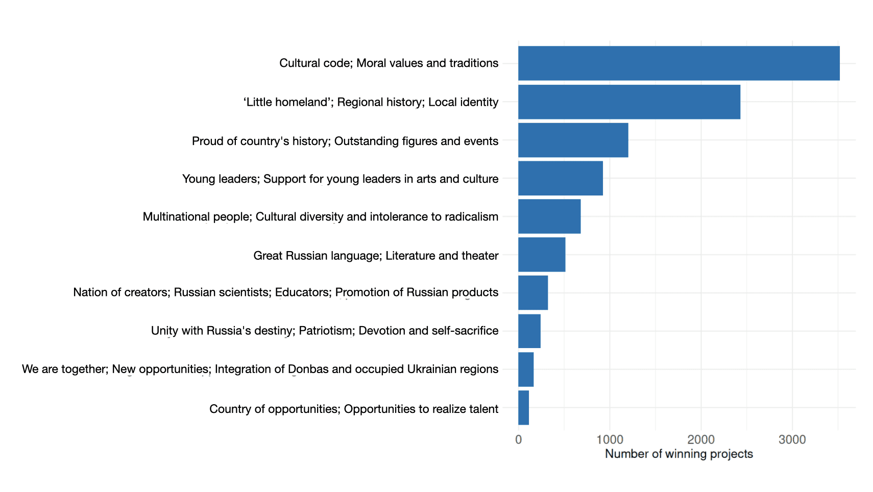 The above chart provides abbreviated descriptions of project themes; in applications they are laid out in greater detail. For example, the most common theme is formulated as follows: “Projects that promote traditional Russian values through culture and creative industries, incorporating traditional crafts, folk art trades, folk and spiritual music and songs, classical and contemporary literature, and traditional and national forms of artistic creativity.” This formulation illustrates how the foundation links the concept of “traditional values” to specific cultural practices and artistic forms.