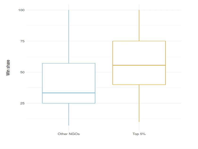 Organizations in the top 5% not only win larger sums in more competitions but also have a higher median win rate compared to other grant-winning organizations. This indicates the formation of a core of trusted organizations, which can reliably expect to win and receive sufficient funding for long-term projects.