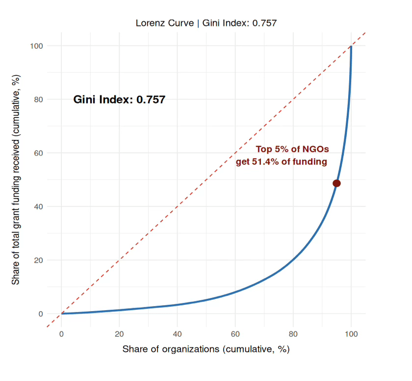 Grant distribution among recipients of PFCI funding, like that of the PGF, is highly unequal. The Gini coefficient—a statistical measure of inequality in which 0 represents perfect equality and 1 represents maximum inequality—stands at 0.757, even higher than the 0.703 for the PGF. This reflects a strong concentration of funding, with just 5% of winners—370 organizations implementing 1,257 projects—receiving 51.4% of all distributed funding, out of a total of 7,409 winners implementing 11,346 projects.